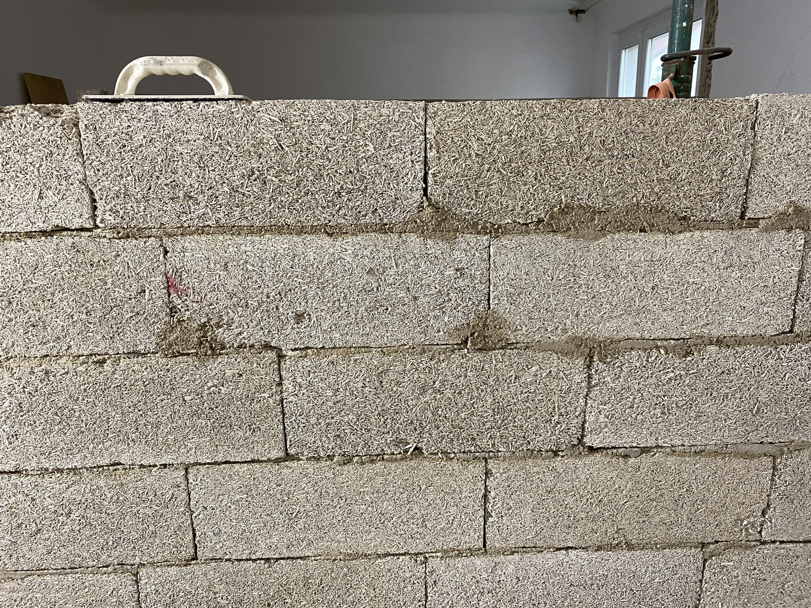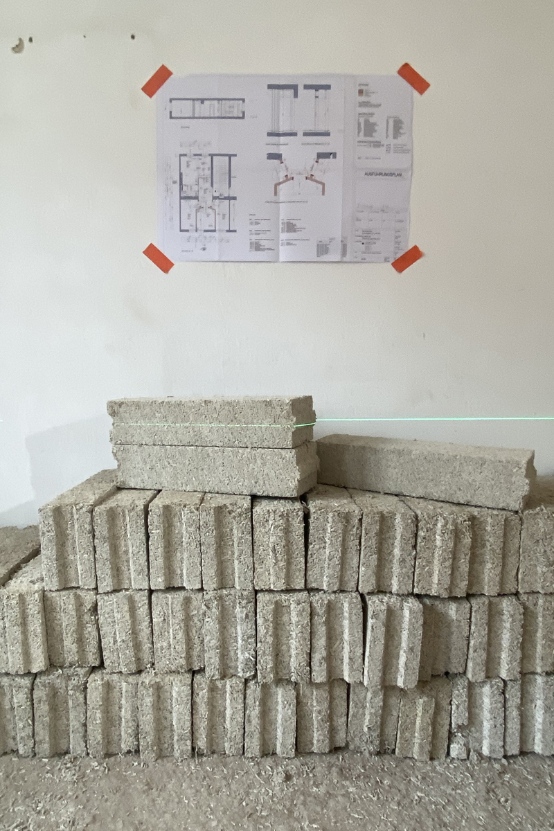 Sie bestehen nur aus Hanfspreu und Kalk, kein Zement, sie werden nicht gebrannt.