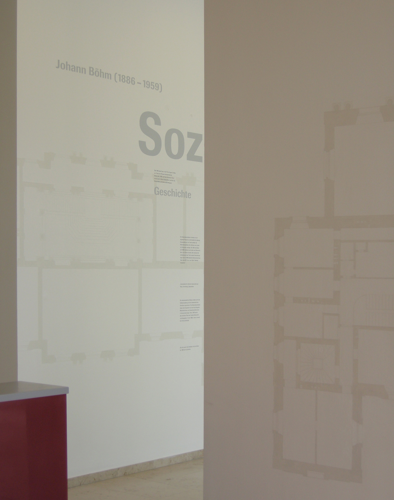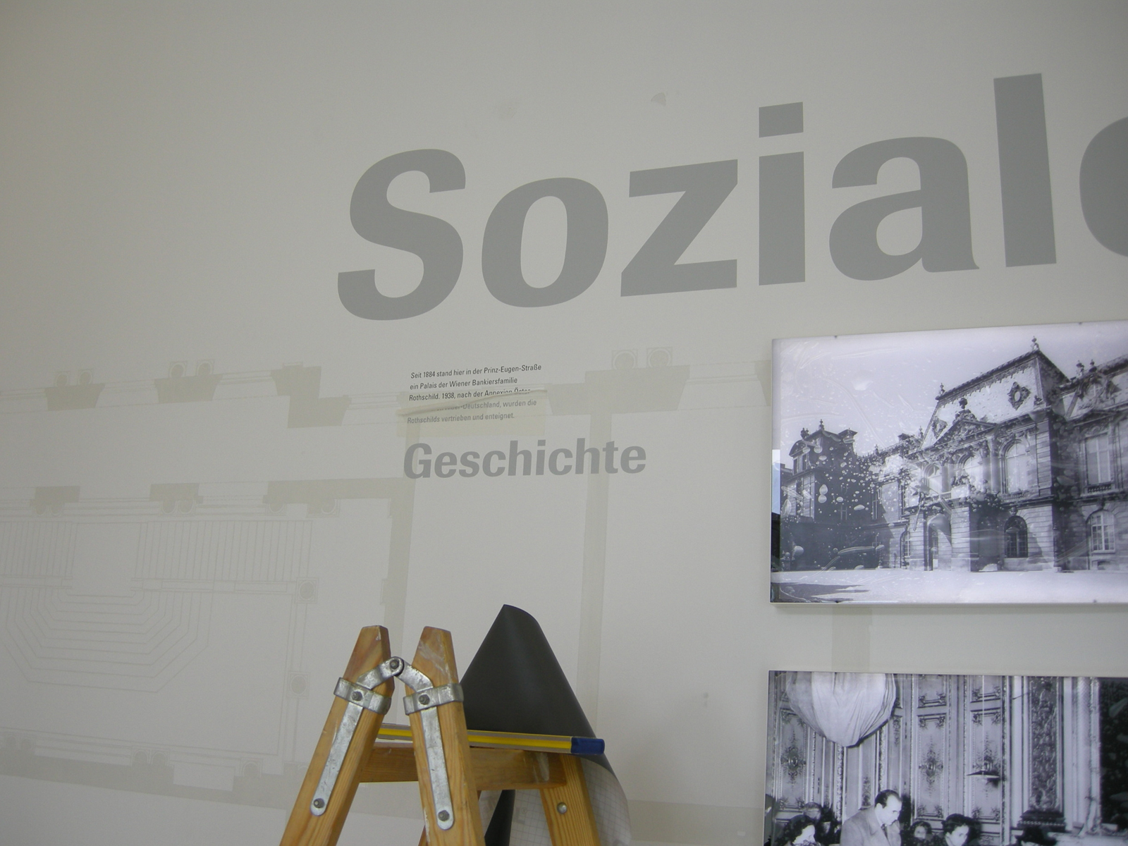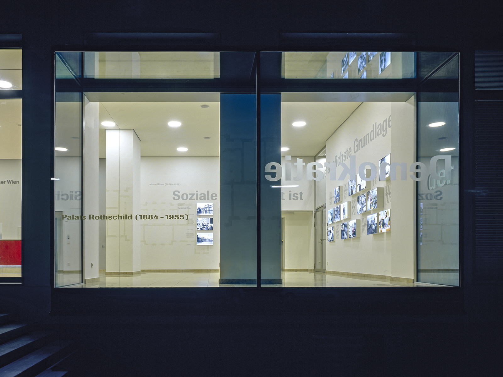 Der Ausstellungsraum liegt stadträumlich prominent mit Fenster zur Prinz-Eugen-Straße. Durch Einbeziehung des ganzen Raumes und des neuen Glaskubus in die Ausstellungsgestaltung erzeugen wir eine Raumstimmung, die über das Bespielen zweier Wände hinausgeht. Die Gestaltungselemente wirken in verschiedenen Ebenen auf den Besucher. Vom blassen, handgemalten Grundriss des ehemaligen Palais Rothschild im Hintergrund bis zum Foto-Leuchtkasten im Vordergrund. Ein umlaufendes Zitat von Johann Böhm, 1886–1959: „Soziale Sicherheit ist die verlässlichste Grundlage der Demokratie“ hält die Komposition zusammen und transportiert die Ausstellung über den Glaskubus in den Außenraum.