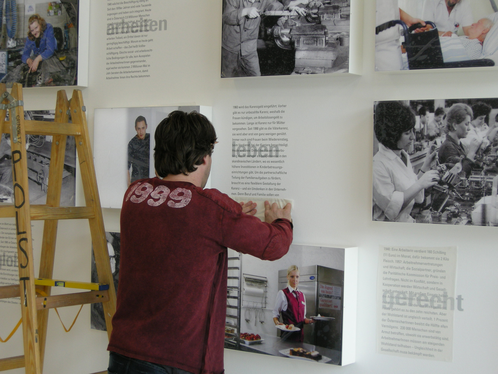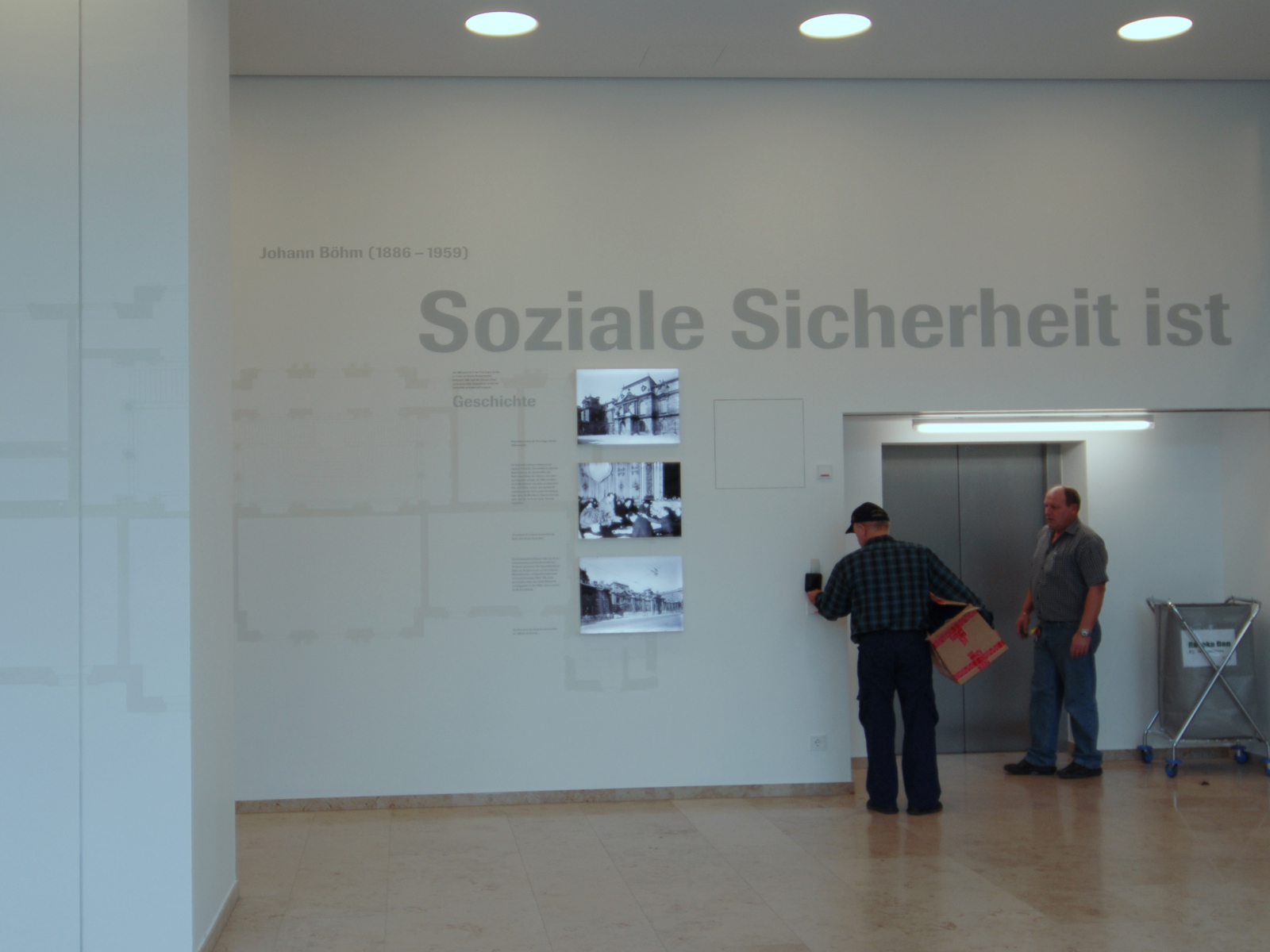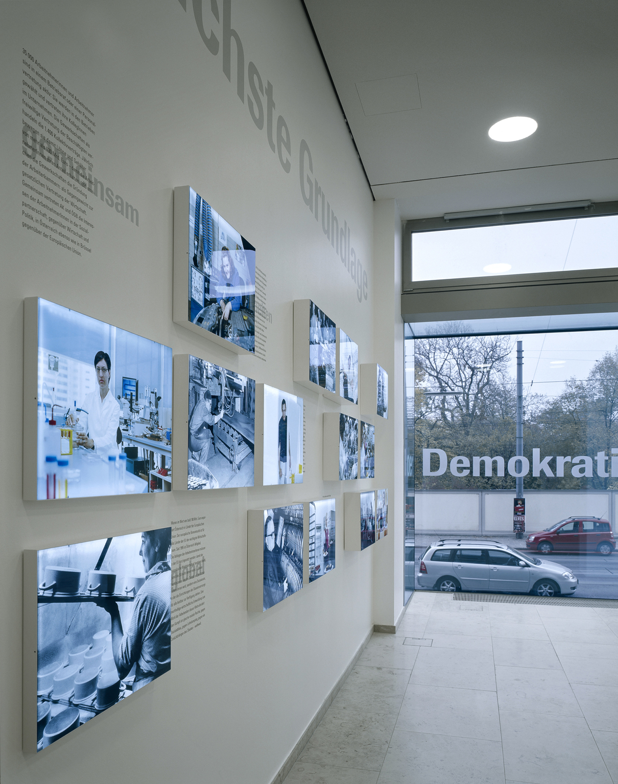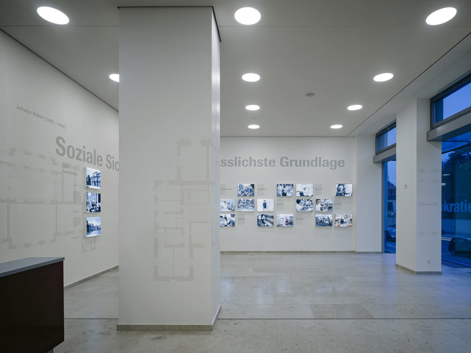 Der Ausstellungsraum liegt stadträumlich prominent mit Fenster zur Prinz-Eugen-Straße. Durch Einbeziehung des ganzen Raumes und des neuen Glaskubus in die Ausstellungsgestaltung erzeugen wir eine Raumstimmung, die über das Bespielen zweier Wände hinausgeht. Die Gestaltungselemente wirken in verschiedenen Ebenen auf den Besucher. Vom blassen, handgemalten Grundriss des ehemaligen Palais Rothschild im Hintergrund bis zum Foto-Leuchtkasten im Vordergrund. Ein umlaufendes Zitat von Johann Böhm, 1886–1959: „Soziale Sicherheit ist die verlässlichste Grundlage der Demokratie“ hält die Komposition zusammen und transportiert die Ausstellung über den Glaskubus in den Außenraum.