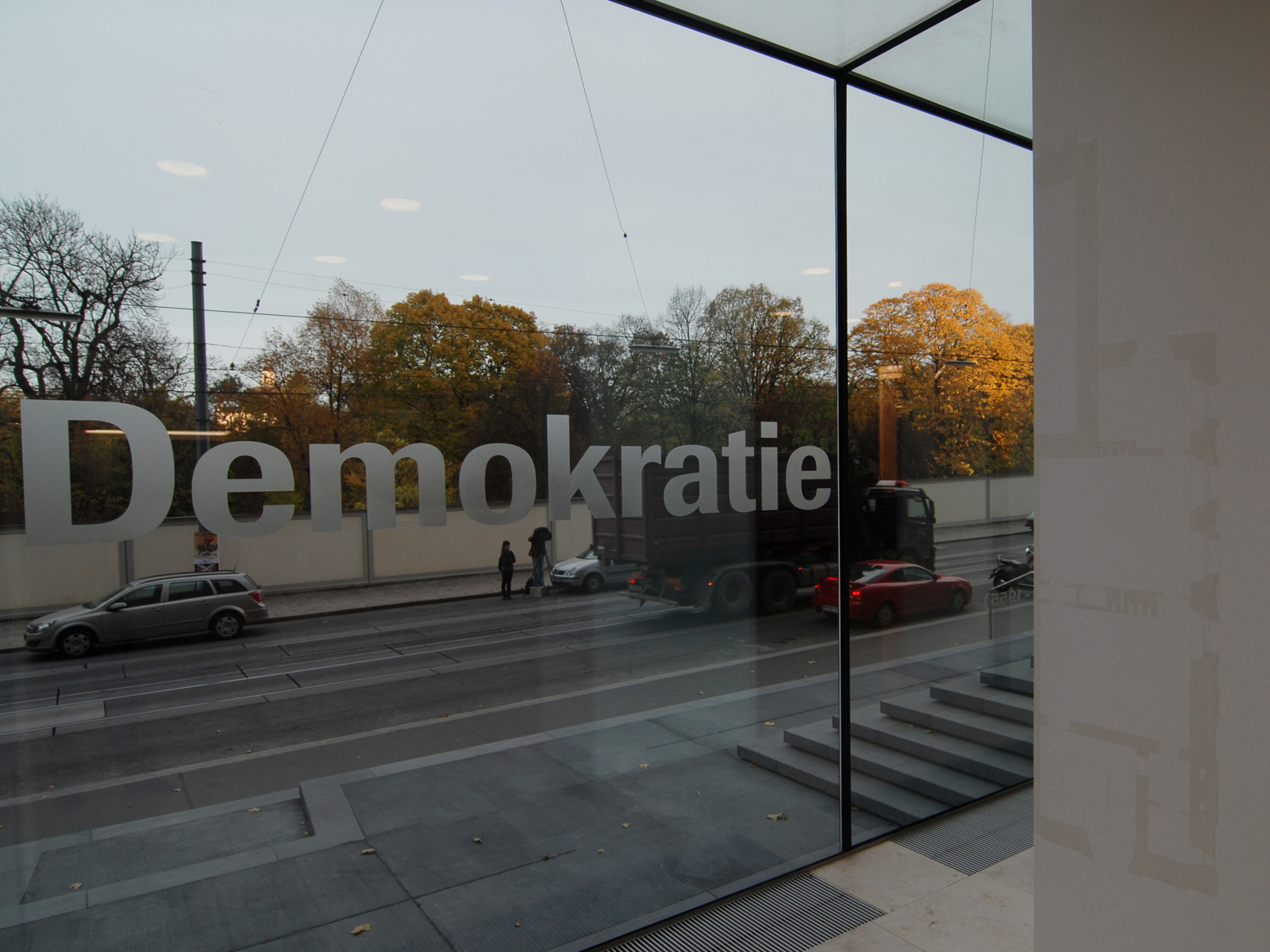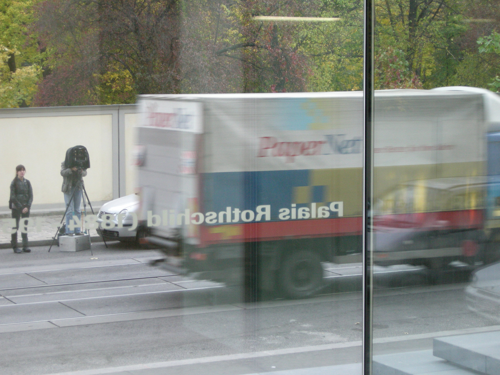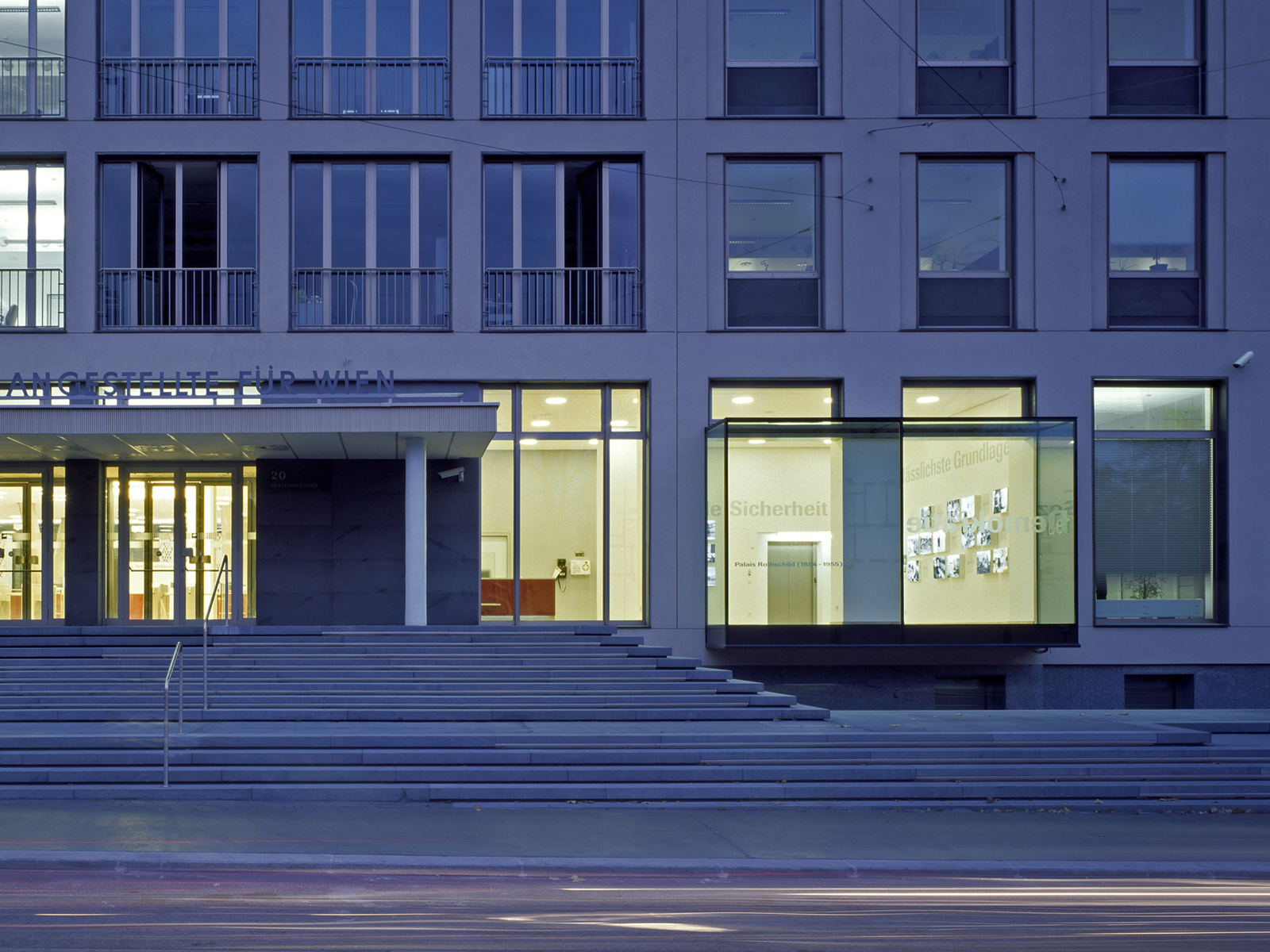 Auf dem Glas, von außen lesbar und in sandstrahltechnik dauerhaft aufgebracht verweist der Schriftzug "Palais Rothschild (1884-1955)" auch im Straßenraum auf die Geschichte des Ortes.
